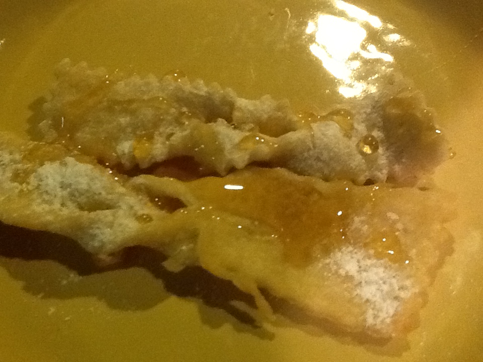 Once the dough is ready, cut a little piece (maybe the size of a fist) and flatten.  Put through the pasta machine several times until it is very thin.  I keep raising the setting on the machine each time I pass the dough through until it goes through level #4 on my machine.  This is the thinness I desire.  Keep flouring if the dough is too sticky.  Lay out the strips on the floured board until ready to cut.  I use a pastry cutter to get the ridged edges.  In a perfect ribbon world, each strip would be about 5 to 6 inches long and 2 inches wide, with a slit in the middle, but this is never the case with me.  It doesn’t hurt to shoot for this ideal though.  After all the dough is formed into these ribbon shapes, heat vegetable oil in one or two deep, large fry pans.  Place them gently into the hot oil. Turn them once or twice.  When they are a golden (not too dark) brown, remove and drain on paper towels.  Once they are cooled, stack them up and shake confectioners sugar over them. Cover them until serving.  You can eat them just like this, and they are delicious, but we always serve honey on the side so everyone can drizzle their desired  amount of honey.