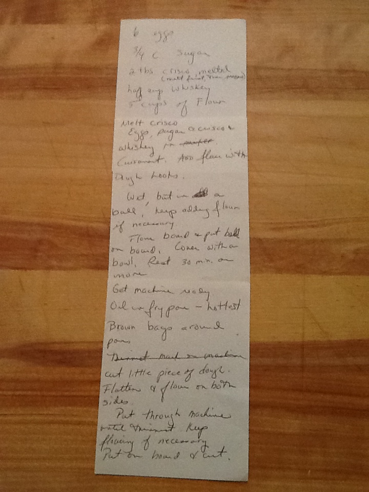 Right now, off the top of my head, I could name you at least a dozen names for variations on fried dough that would knock your culinary socks off.  And it seems that every time I speak about one of these delicacies, I learn of another recipe for fried dough that was a tradition in another family.  Talk about imagination!  This recipe for ribbons, that I will share with you today was a Christmas tradition in my mother’s family, but I believe the recipe she used all these years came from her “Cook, Bake, Pray” friend Anne, who you met in the “Christmas Cookies” post.  Many years ago I found the remains of this recipe in my mom’s folder with Anne’s name on it.  It was truly illegible, and I had to call my friend for the recipe, which is what we have here.  I think the original one disintegrated, and my mom’s mom made it from memory.
