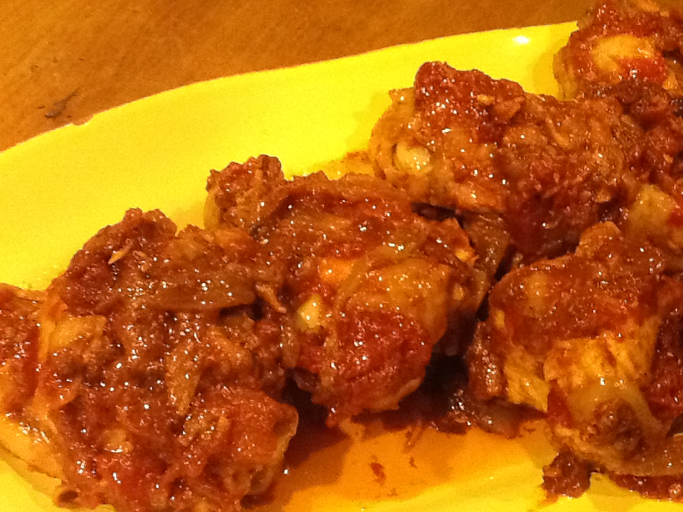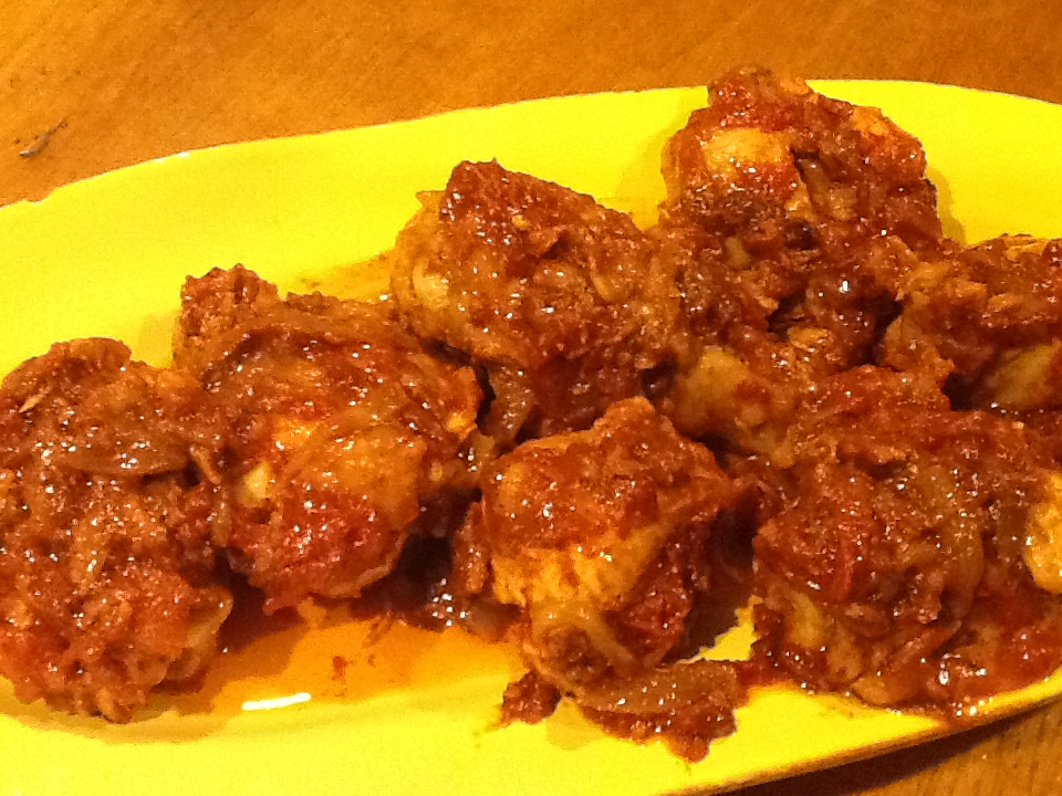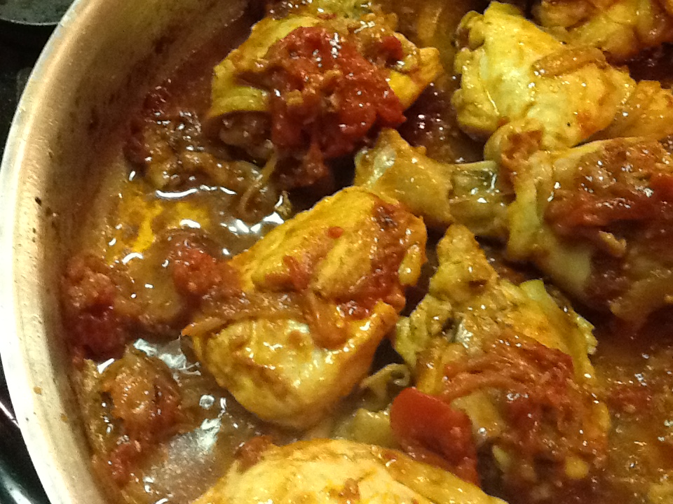 Saute the sliced onion and bacon in the olive oil in a heavy skillet for a about 5 minutes. Add the chicken pieces and brown. Lower heat and cook for 20 to 25 minutes, turning often. While cooking, add lots (thats the best I can do, sorry) of grated fresh nutmeg while the chicken is cooking. Then add 4 of 5 handfuls of plum tomatoes, squished in your hands (no juice), salt and pepper to taste. Cook another 20 minutes on low flame, turning often. Feel free to add more oil if you need it, and certainly add more nutmeg.