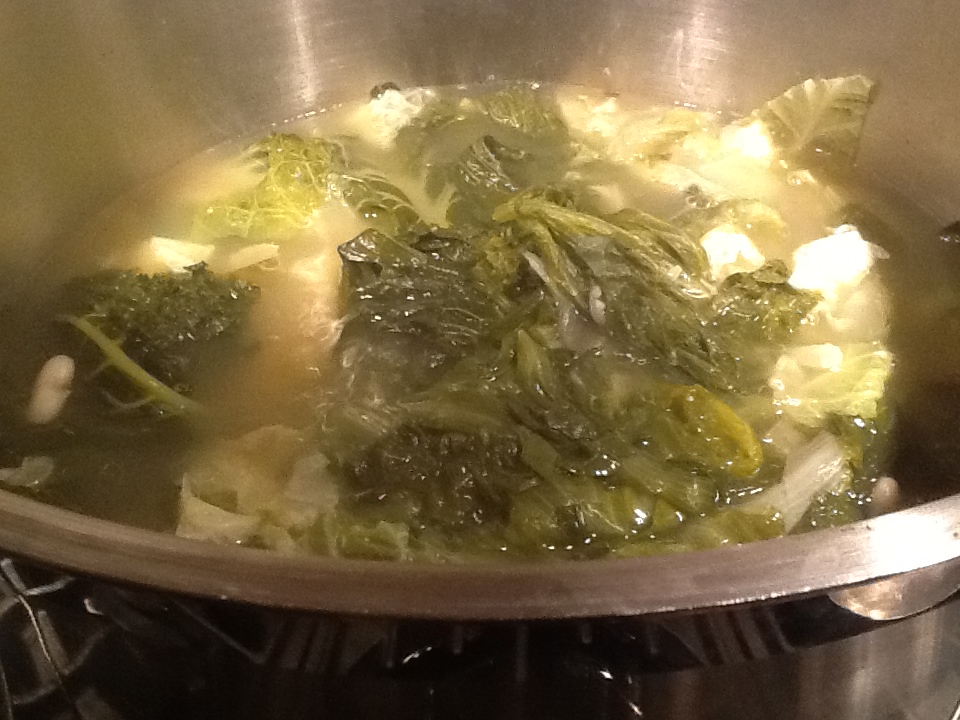 So for the past thirty-six years, I have been asking my cousin for the recipe, but to no avail. Her answer has always been that she did not have a recipe. She learned how to make this dish watching and helping her grandmother. Her jobs were to pick the stones out of the soaking beans and rip the leaves of all the greens into large pieces, as her grandmother believed that cutting them with a knife destroyed the vitamins. Who knows, this could be true. For the sake of argument, we will “rip” while making this recipe.