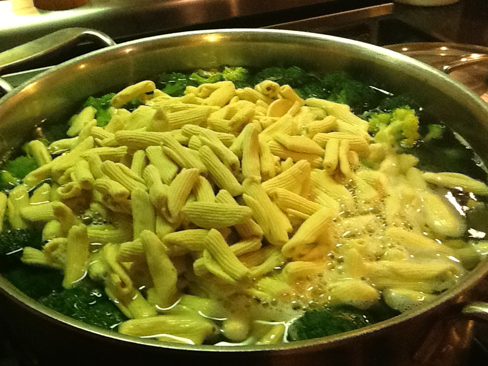 3. Add the broccoli. Let it cook for 5 minutes. Add the pasta. Stir.