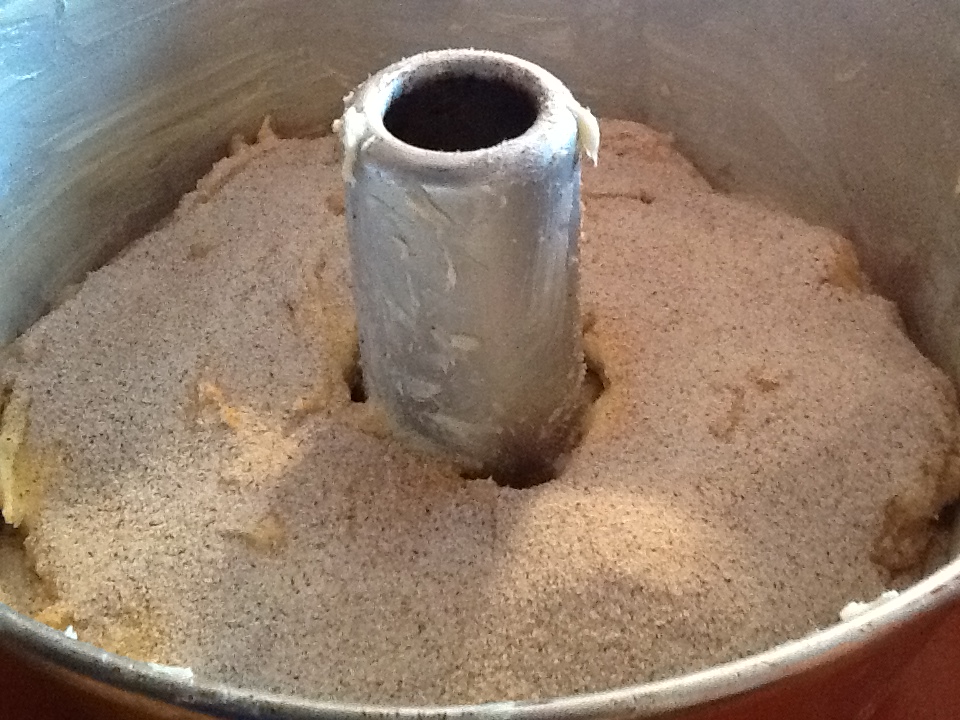4. Put half of the batter into the pan. Add half of the sugar mixture. Put in the remainder of the batter and smooth it around on top to cover all the filling. Then sprinkle the remainder of the sugar mixture on top.