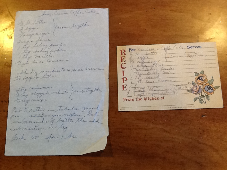 You will want to grab a cup of coffee for sure, once you sit down to eat a piece of this Sour Cream Coffee Cake. If you think you can bake this and save it for the next day’s breakfast, you’re fooling yourself. You’ll be lucky if it sticks around that long. In my house this usually disappears in a matter of hours. Every time I walk by it on the counter, I notice that someone has whacked off a another piece. So pay no attention to the time of day, just grab a piece while you can and sit and enjoy. That is how I remember this coffee cake being experienced. In the 50s and 60s, life seemed to move at a slower pace, especially for women. People seemed to visit one another more frequently. I remember my mother’s friends stopping by in the afternoon for coffee, cake and some good conversation. This sour cream coffee cake was a favorite of her guests, and it always made me happy to see it on the table when I got home from school. I wish I could say that I still make this cake for my afternoon entertaining, but times have changed and this is a ritual from a past era. When I get together with my friends now in the afternoon, it is for a walk, golf or some other form of exercise. However, this coffee cake is always in my repertoire for brunch or luncheon. Or perhaps I may sneak a piece in the afternoon after exercise.