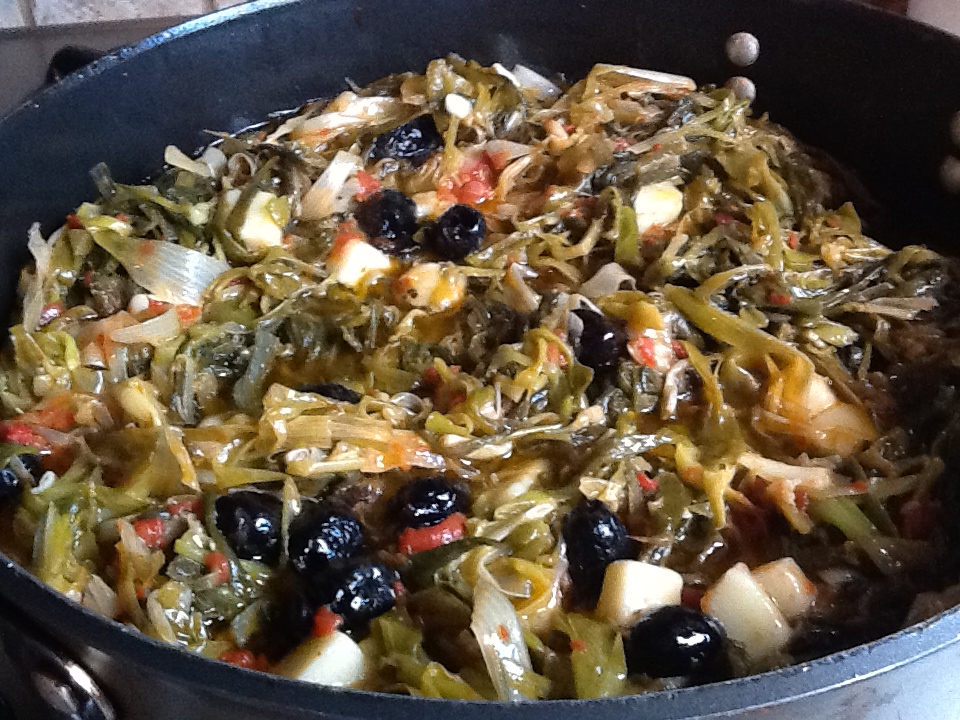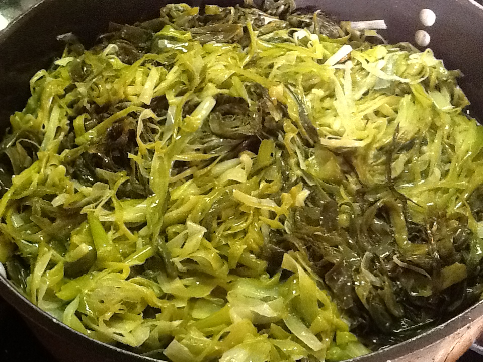 2. Heat 1/4 cup olive oil in each large fry pan. Add the green slices to one pan, and cover. Add the white slices to the other pan, and do not cover. Cook over low heat and stir often, until soft.
