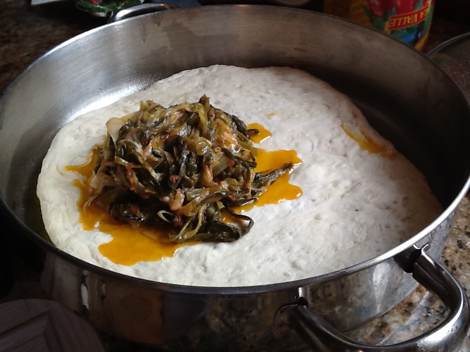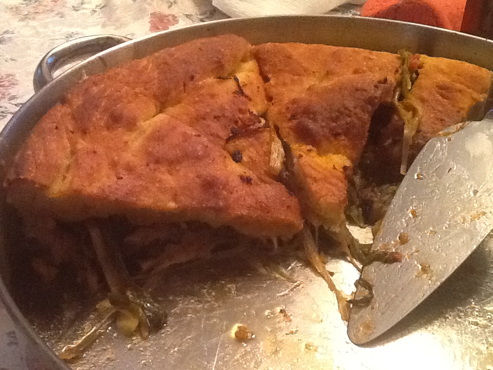 4. Put a little olive oil in the bottom of the round pan to lightly coat the bottom. Roll out 1 pound of the pizza dough to fit the bottom of the pan and place it in the pan. Add the scallion filling on top of the dough. Place whole anchovy filets on top, using as many as you like. Roll out the second pound of dough and place on top. Lightly brush the top with the leftover oil and bits from the fry pan (credit to my sister on this) and puncture a few times with a fork.