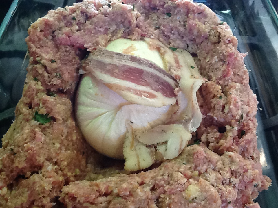 3. Wrap the prosciutto or pancetta around the mozzarella and place in the hole and cover it with the meat mixture. Basically you are stuffing the meatloaf with the mozzarella and prosciutto.