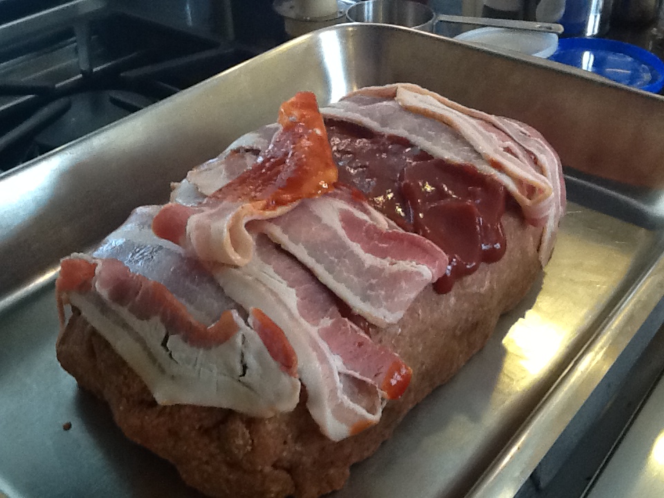 4. Cover the top of the loaf with ketchup, and then with the bacon slices, crosswise.