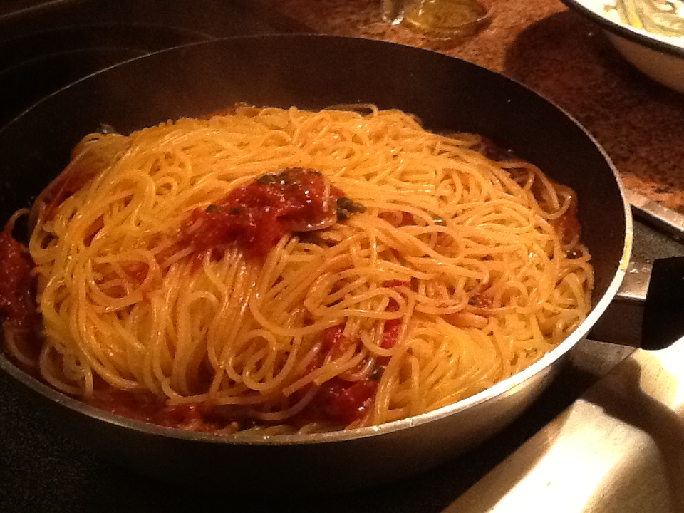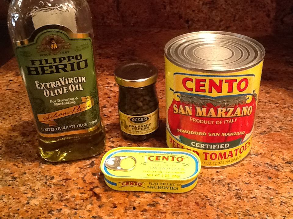 Here’s another quick pasta dish that I’m certain you will love. If you don’t like anchovies, you can leave them out. It will still be delicious as I am a firm believer in “your sauce is as good as your tomatoes.” My preference by far, is to use only canned San Marzano Italian peeled plum tomatoes. This means that the tomatoes come from San Marzano, Italy, and it must say “Product of Italy” right on the can. There is something in the earth where these tomatoes are grown that makes them so delicious and good for you. I heard on a Dr. Oz show that San Marzano tomatoes are one of the top four cancer fighting foods. And just an aside, so are white beans, so check out my recipes for pasta e fagioli and menestra e fagioli. Honestly, these tomatoes are so good, that you could eat them out of the can and be happy. Please don’t. I’m just trying to make the point of how important good tomatoes are in a recipe. The anchovies definitely add flavor, so please use them unless you just don’t like them.