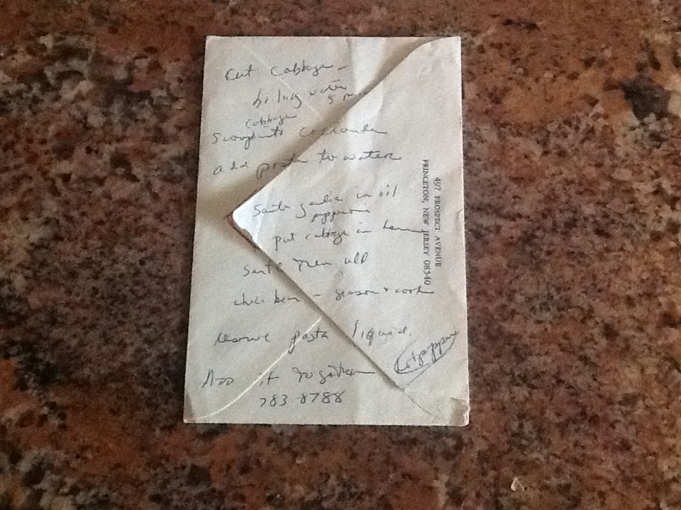 When my sister-in-law Maria calls, and says she’s just made a delicious dish, I run for a pen and paper, especially if it’s pasta dish! When she called me with this recipe many years ago, I listened carefully as she described it, wiped the drool from my mouth, and ran for the nearest writing utensils. As you can see from the picture of this recipe, I grabbed a piece of mail, tore it open and used the envelope to write down her instructions. As with most good Italian cooks, you have to take notes quickly, as they are so excited about the taste of the dish, that they talk quickly and may leave something out in their excitement. Her passion for cooking can be felt over the phone. You can almost taste the flavors and smell the ingredients while she colorfully describes the cooking process.