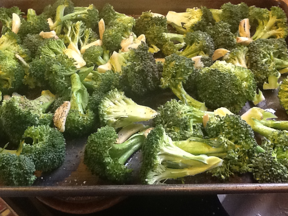 3. Place the broccoli florets on a sheet pan large enough to hold them in a single layer. Toss the garlic on the broccoli and drizzle with 5 TBSP olive oil. Sprinkle with salt and pepper.