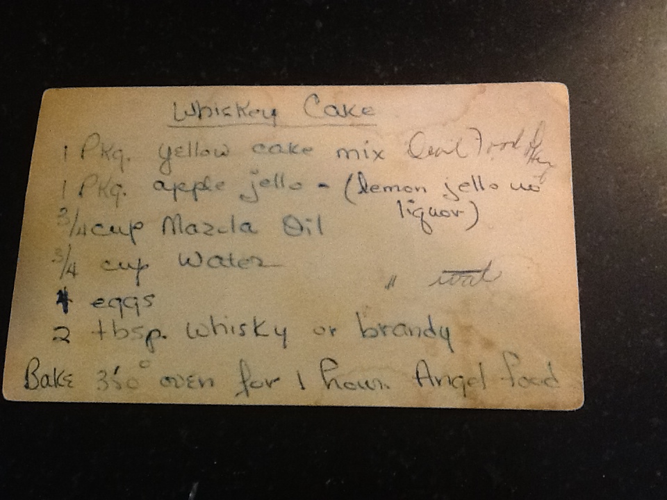 For a real taste of nostalgia, I love to pull out one of Ginny’s cake recipes, with her very distinct handwriting. They never cease to delight. I sometimes feel that I have pulled away from this simple, yet delicious way of baking, and get all too caught up in deserts that you might see made on TV shows like “The Cake Boss.” I’m not saying that you can compare the two, but there is a true “homemade” taste to this Whiskey Cake recipe (and other Ginny cake mix creations) that takes me back in time to when food food was simple, and so was life. Or so it seemed.