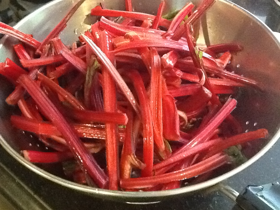 2. Put the stalks in one pot and the greens in another, covered with water. Bing to a boil. Cook the stalks for 25 minutes and the greens for 20. Drain.