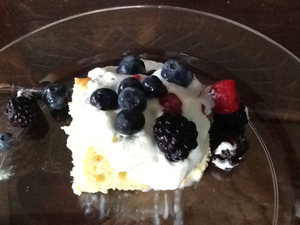Tres Leches (three milks) cake is a sponge cake soaked in evaporated milk, sweetened condensed milk and whole milk.  It is believed to have originated in Latin America, as it is a popular desert there, but this fact is somewhat disputed.  Many Spanish cultures claim this desert for their own. It reminds me of rum cake or tiramisu, but only lighter.  I wish I could say that I was given this recipe by someone with a Spanish heritage, but I was not.  Despite the fact that this recipe was given to me by a friend from England, it is a very authentic recipe.  There are many variations of this cake, but every time I have made this for friends from Spain, Cuba, Mexico and Puerto Rico, I have received rave reviews.  They tell me it tastes “like home.”  This makes me happy.  Actually, this cake makes me happy.  The whipped cream and berry topping add a freshness to it.  It is light and airy, and is a perfect ending to any meal, especially a barbecue.  I suppose I feel this way because I seem to make this desert mostly in the summer, when berries are deliciously sweet and abundant.