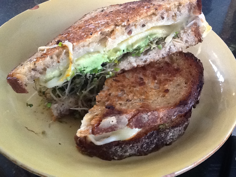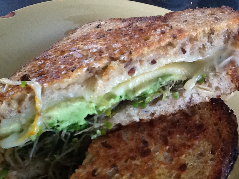 How can a sandwich need a recipe? How can a sandwich have a memory attached to it? Well, my favorite sandwich has both. When I first came upon this sandwich in a tiny restaurant in Montclair, New Jersey 26 years ago, it was very exotic, as far as sandwiches went at the time. The usual “sandwich faire” was tuna fish salad on rye or perhaps turkey and swiss on whole wheat bread. Oh yes, the classic “Reuben” was in vogue, but way too fattening. There were no fancy panini then. So when a friend and I sat down to this healthy and delicious sandwich, we were on a mission to duplicate it at home. How hard could it be? We knew the ingredients were muenster cheese, avocado and alfalfa sprouts. But could these three simple ingredients add up to all this flavor? It took several attempts to perfect it, and we soon realized that the secret is in the bread and the cooking process. You need exceptional, grainy, dense bread. You also need to butter the bread before cooking, in the same manner of an old fashioned grilled cheese sandwich. This is what gives it the perfect “crunch.” We were ecstatic once we “broke the code” for our favorite sandwich. Now we could enjoy this sandwich frequently (I ate it almost every day for several months) in our own homes. We would call each other daily, at lunchtime (if we weren’t already together) and would talk and crunch and moan over the deliciousness of our sandwich. However, there was one problem. This sandwich, in it’s pure form, was probably as fattening as the Reuben. We started to notice our waistlines expanding, and realized that we had to remove it from our daily lunchtime routine. I still enjoy indulging in this lunchtime treat from time to time. I can’t resist it. I have figured out some ways in which to lighten it up, and they really don’t detract from it’s authentic taste.