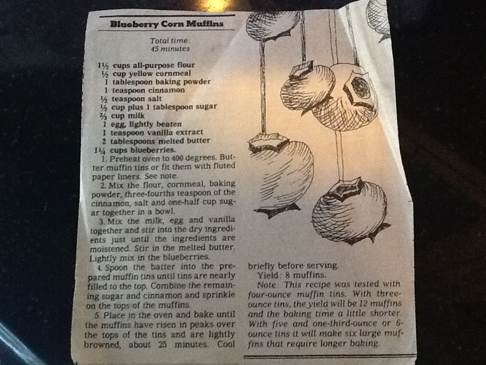 This recipe for Blueberry Corn Muffins is indeed one of my favorites. It is not too sweet, so you really taste the blueberries, and the cornmeal gives it a bit of substance. Don’t get me wrong, I love those light, sweet, cake-like blueberry muffins as well ( and will also share some of those recipes with you at another time) but there is something about this muffin that has had me making it for many years. There were several summers, when my children were young, that many conversations with my girlfriends consisted of recipes for summer fruit in season. We would sit at the pool and swap so many recipes, that I really can’t remember which friend passed me this recipe, cut from a newspaper. But what I do recall is how much fun we had those lazy summers, when our biggest problem was what to do with all the fruit we would buy at the local farm before it went bad. Well, maybe that wasn’t our biggest problem, but that’s what we focused on. What fun!