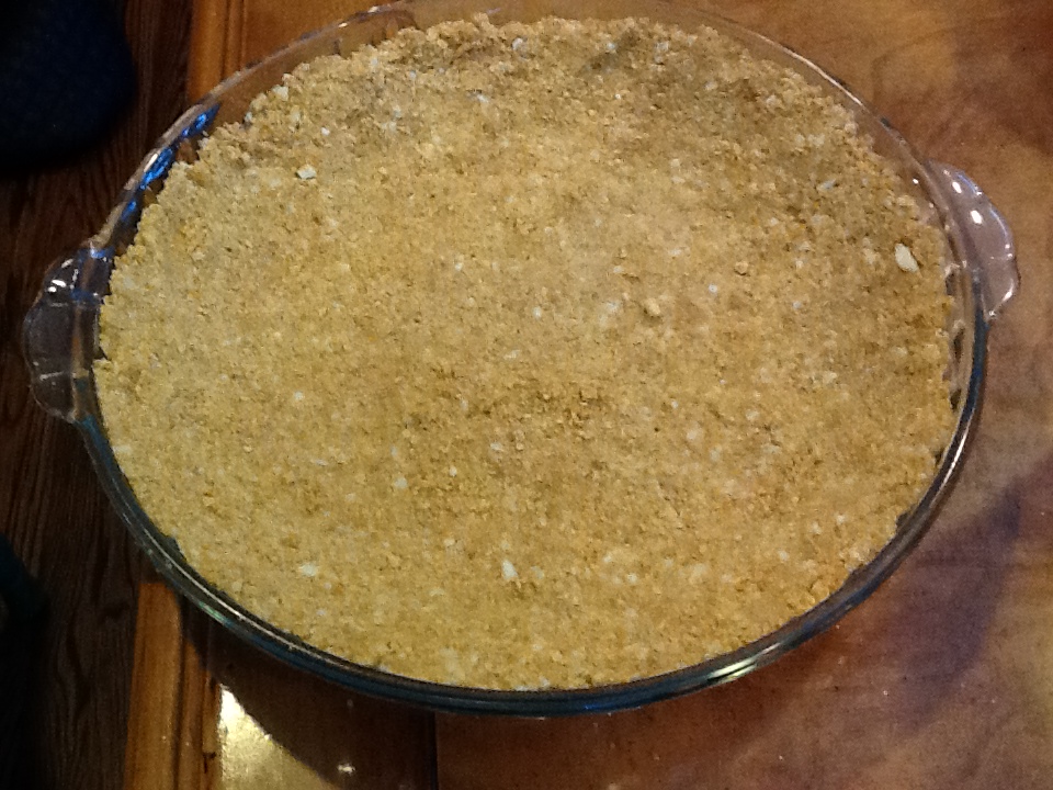 3. Use the mixture to line the bottom and sides of a 10-inch pie plate. Bake eight to ten minutes. Remove the crust to a rack and cool completely.