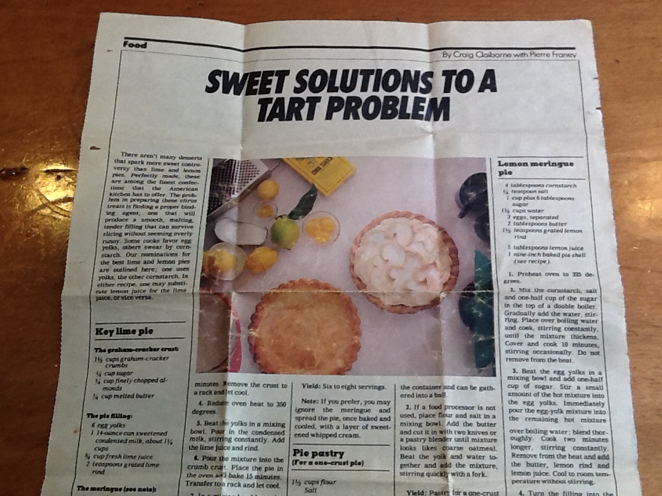 But the real “winner” is from this recipe that I tore out of the New York Times Magazine in 1981 by Craig Claiborne and Pierre Franey. These two chefs were culinary icons at this time, and their recipe intimidated me. Was I up to their standards? I didn’t think so at the time, but I simply had to give it a try. Even though I keep comparing it to many others, I always come back and say “this one is simply the best.” I think the meringue could have something to do with it. You be the judge, and please let me know what you think. And if you have a better recipe, or a restaurant to recommend, please do. I just can’t get enough of this Floridian sweet.
