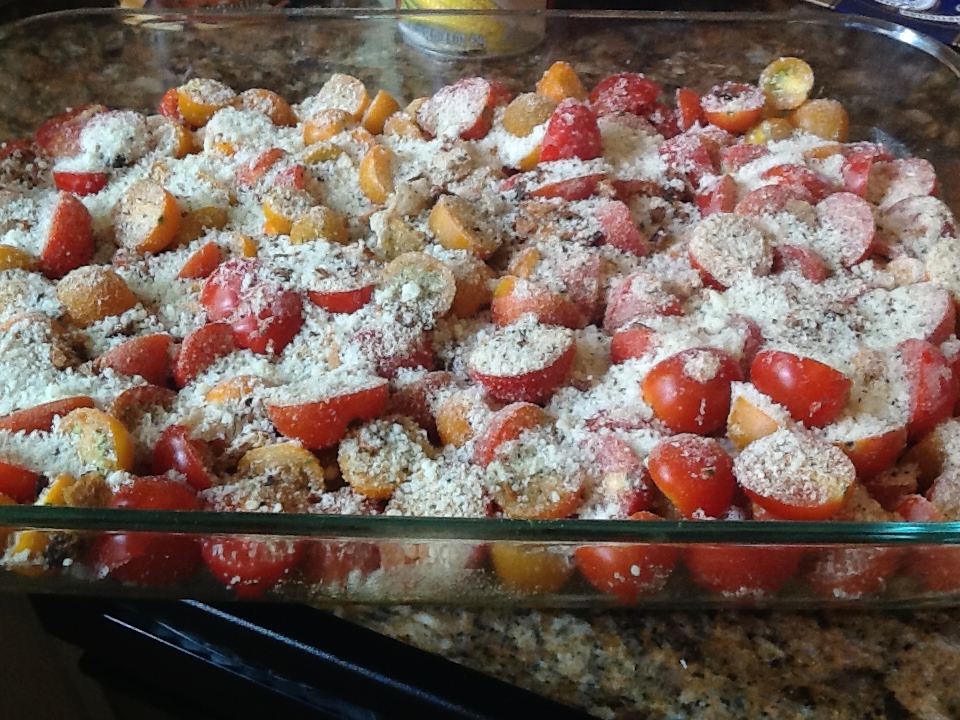 1. Preheat oven to 425 degrees. Line bottom of casserole dish with cherry tomatoes in a single layer, halved side up. ( I crowd them all together and don’t pay too much attention to what side is up). 2. Pour oil on top. Season with salt and pepper. Sprinkle cheese and bread crumbs on top. 3. Bake until tomatoes have wilted, about 20 to 25 minutes. 4. Meanwhile, bring a large pot of salted water to a boil. Season with enough se salt so that the water tastes mildly salty. 5. When tomatoes are just about done, add penne to water and cook until al dente. Scoop out about a cup of pasta water and reserve. 6. Drain pasta and add to casserole. Place over medium heat and fold tomatoes and pasta together, adding another 2 to 3 tablespoons of oil, to coat. Taste and adjust seasonings. If it is too dry, add a little reserved pasta water. 7. Serve, passing more grated cheese at the table.
