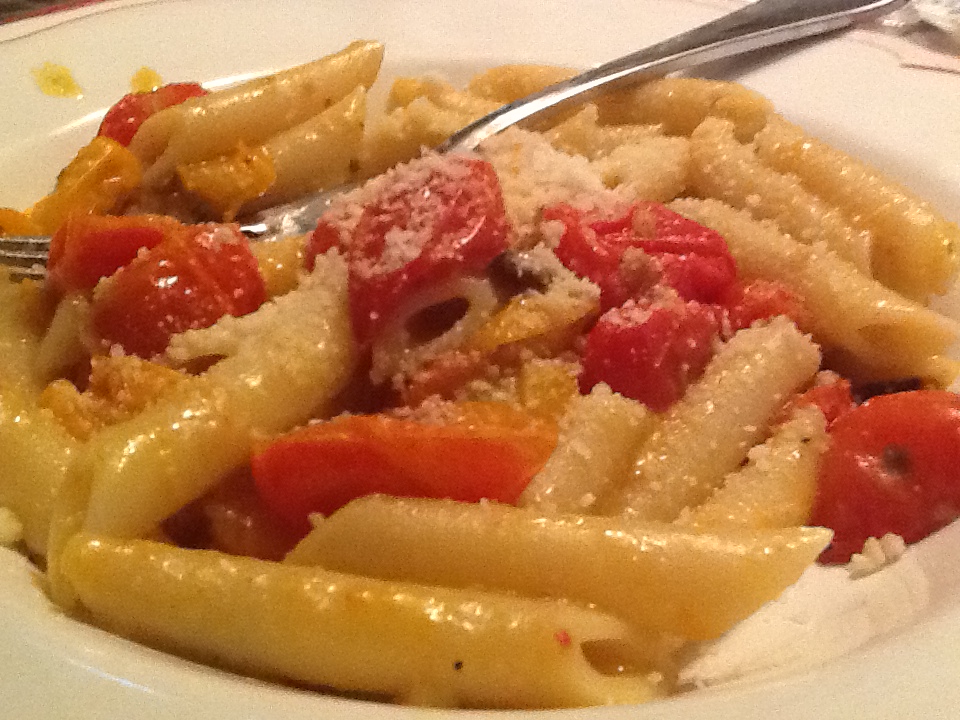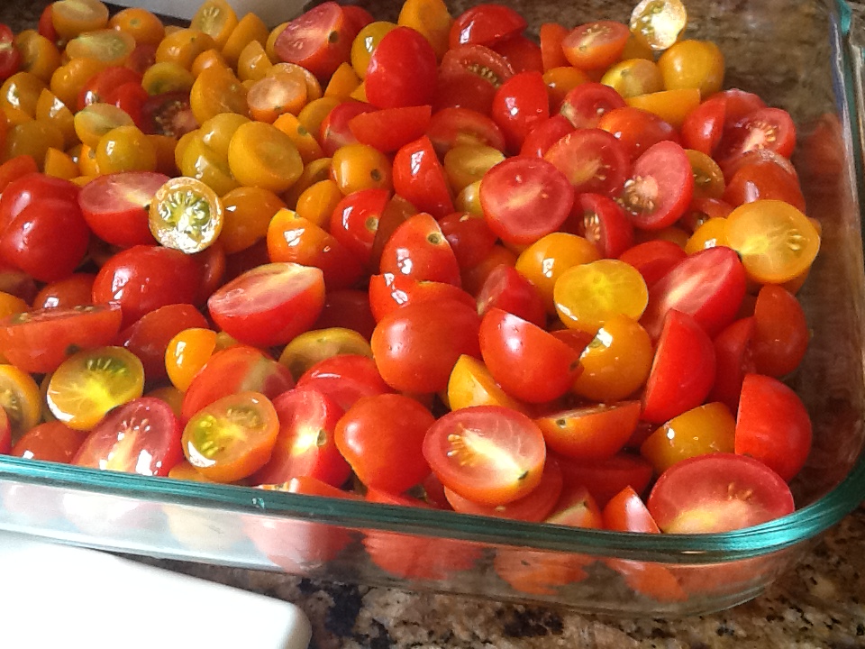 2001 was the year of the “cherry tomato.” When I look through my folder of pasta recipes, I laugh at all the different recipes using cherry tomatoes that my friends and I shared during this period. We were crazy for these red, juicy, flavorful little tomatoes. Over the years, we have seen yellow ones, orange ones, and even some purple colored heirloom types appear at farmers’ markets and supermarkets. I love using these tomatoes whenever I can. When I first came upon this recipe in 2001, I thought that perhaps I could substitute this sauce for a Sunday “red sauce” for my family. It’s a bit richer and thicker than the other cherry tomato sauce I have posted. But while everyone thought it was delicious, it just didn’t cut it for my Italian family, who only wanted a heavy red sauce (“ragu”) on Sundays. Really people, not even in the summer?? I did try this several times when we were gathered at the Jersey Shore ( notice I didn’t say “down the shore”), but still it was a “no go” for Sundays. Thank goodness times change, and so do people. Now even my 92 year old dad enjoys this roasted tomato sauce on Sundays. I just made it for him this past Sunday, and after his second bowl, he said, “why don’t we have this more often?” And, as you will see from the pictures, I didn’t use only red tomatoes! The beauty of this dish, aside from the colorful presentation, is that it can all be made in under thirty minutes. Once you put the tomatoes in the oven, you just boil the pasta water, cook the pasta al dente, and then it all comes together at one time. I promise you that this dish will become a mainstay for your family, yet elegant enough for company. I’ve “wowed” many with this dish, especially unexpected company. I usually have cherry tomatoes in the refrigerator, and of course, the other ingredients are staples for any Italian home cook. I hope Sunday’s leftovers are still in the fridge. It’s yummy cool as a pasta salad as well.