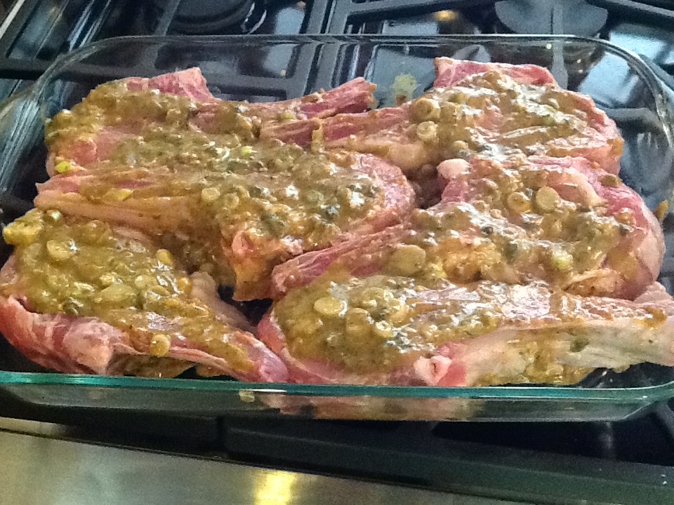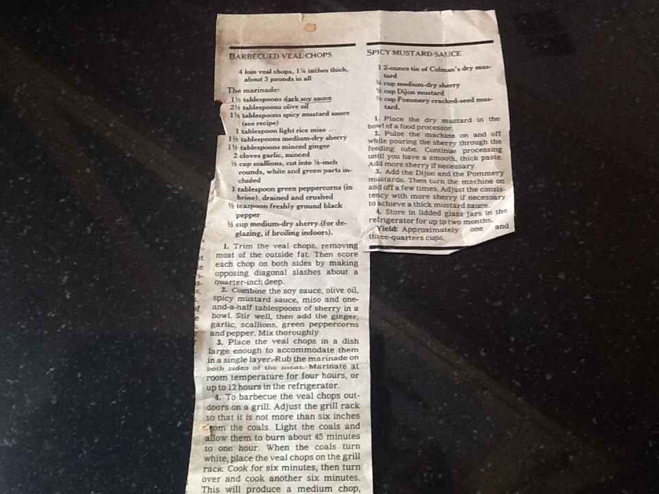 Recently, we were having a dinner party for 6 meat loving friends. I decided to take the challenge, and prove to myself that I can grill as good as the next guy/gal. After all, I have watched enough episodes of chef Bobby Flay on the grill. I also have another secret weapon. I had a foolproof recipe for barbecued veal chops that I tore out of the New York Times Magazine in 1985. At that time, I was planning my first dinner party where the food was to be cooked on a grill. I was nervous, to say the least, but this recipe was very explicit in it’s directions. It worked to perfection then and has not failed me since.