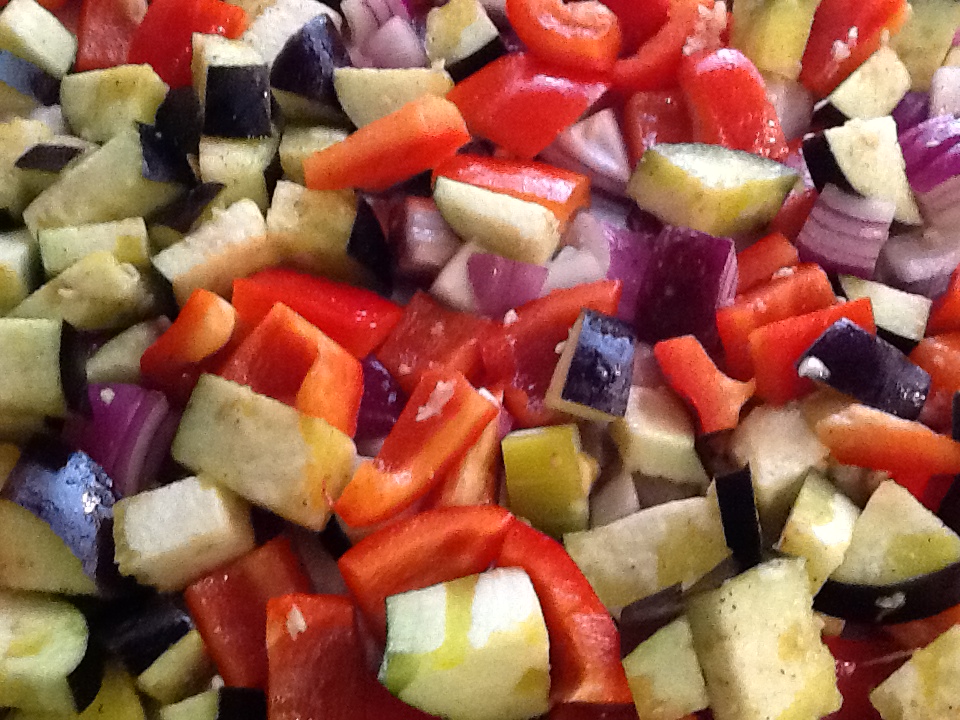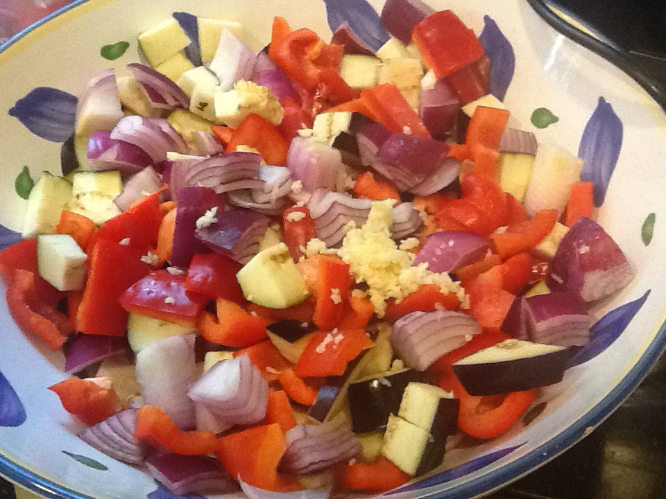2. Cut the eggplant, bell peppers and onion into 1 1/2 inch cubes (roughly).