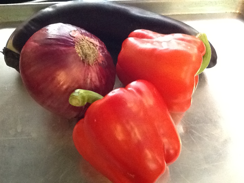 1 large eggplant, NOT peeled. The skin gives a great texture and color.