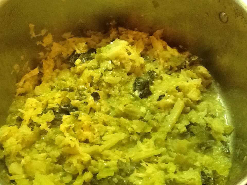 6.  When tender (about 45 minutes, but make sure it is tender), add 1/4 cup of grated cheese.  Stir and cover again for 5 minutes.  Add another 1/4 cup cheese and cover for another 5 minutes.  Uncover and cook for another minute or two.  Taste for seasonings.