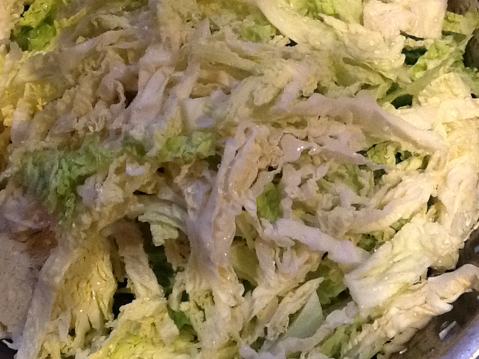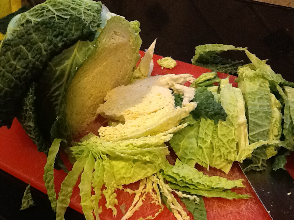 1.  Shred the savoy cabbage roughly into thin strips.  Wash.