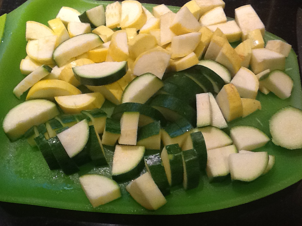 1. Wash and cut the zucchini into roughly half inch pieces. I generally cut the zucchini in quarters lengthwise and then slice.