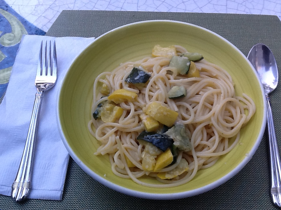 This dish of spaghetti with zucchini was definitely one of my favorites. It showed up often in my mother’s selection of “during the week” pasta recipes, so I was happy. If it didn’t, I knew I could invite myself to my Aunt Rose’s house on a Tuesday or Thursday, and sure enough she would probably be serving this. In the very economically lean years of my first marriage, I made this at least once a week. I think that I perhaps I over-did it, and so I put this recipe to rest for many years. But once I brought it out of the archives again, I have been making it a lot. It couldn’t be easier, and it is so light and delicious. I hope you’ll give it a try, and it doesn’t have to be on a Tuesday or Thursday. It’s delicious any day of the week!