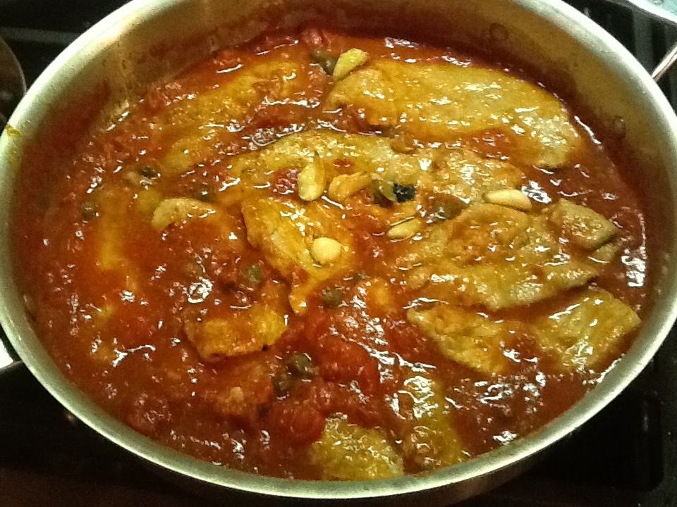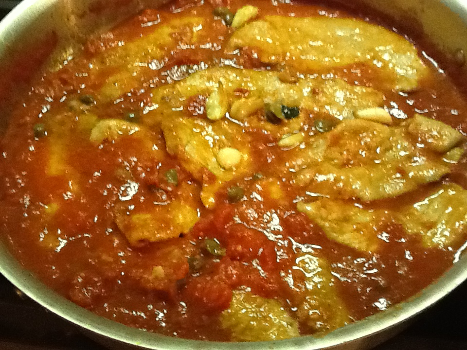 5. In 15 or 20 minutes, when the fat floats free of the tomatoes, add the oregano and capers and stir thoroughly. Return the scaloppine to the pan and turn them once or twice in the tomato sauce for about a minute until they are warm again.