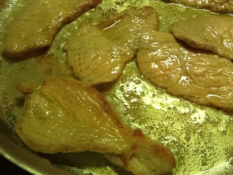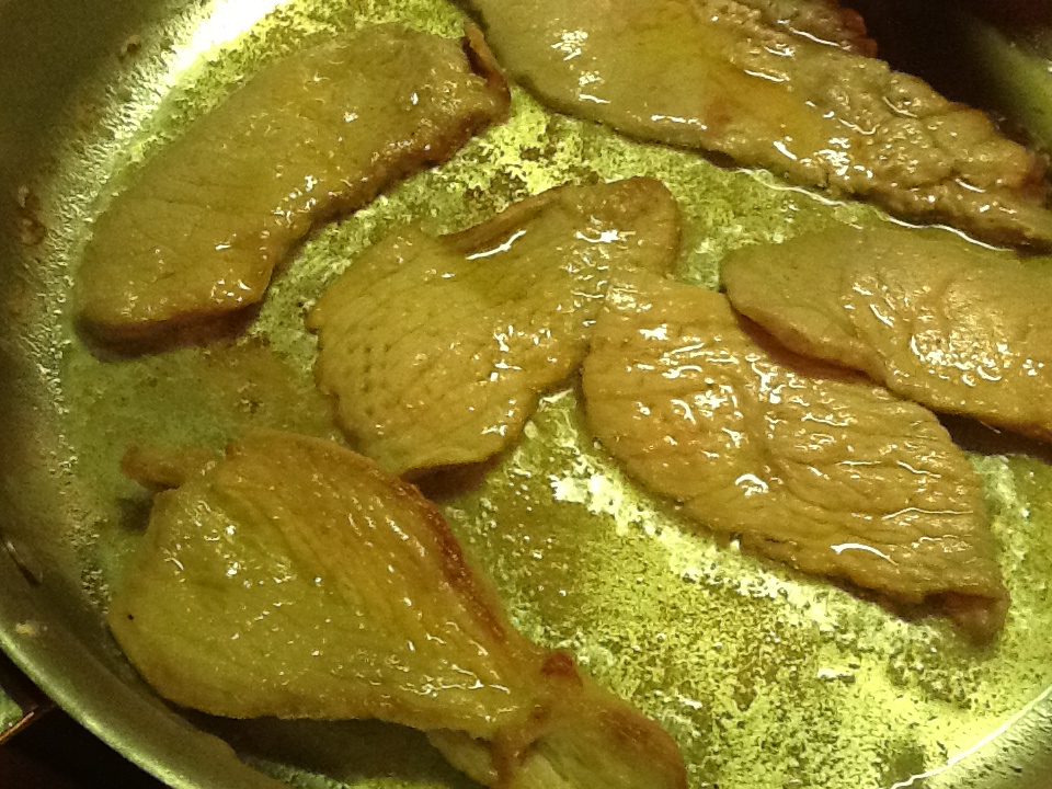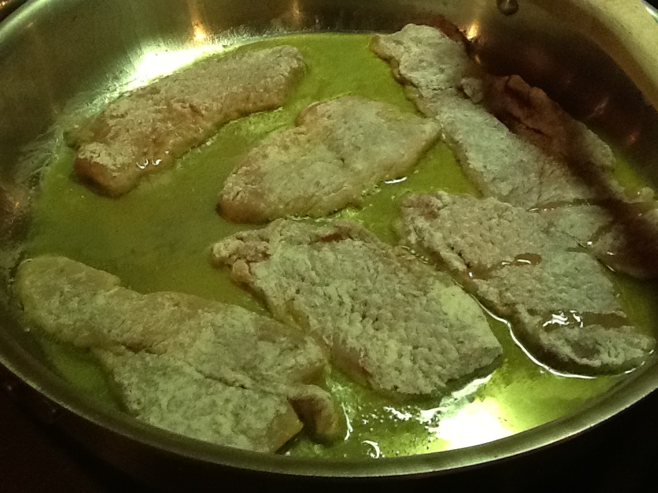 2. Turn up the heat to medium high. Dredge the scaloppine in flour, by dipping both sides in the flour and shaking off the excess. Saute the veal very rapidly on both sides in the hot oil. Do not overcook. It is sufficient to brown them lightly, which should take a minute or so on each side. Never dip the scaloppine in the flour until you are ready to cook them or it will not brown properly. (Marcella’s cookbooks taught me this……and it is absolutely correct!).