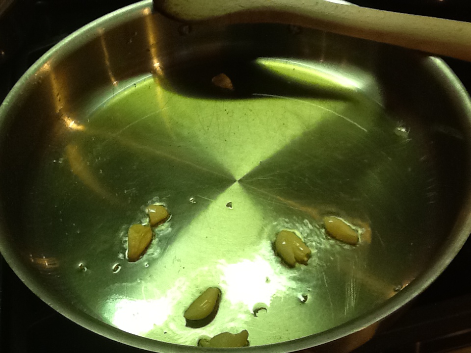 1. Put the oil and garlic in a skillet, turn on the heat to medium, and cook the garlic until it becomes a light nut brown. Remove it from the pan and discard it.