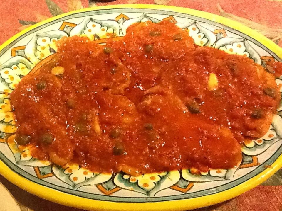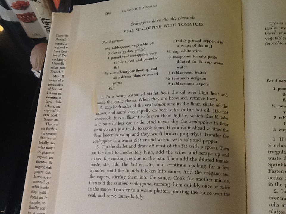 Ever since Marcella Hazan died in late September, I’ve been wanting to post my favorite recipe of her’s, but it wasn’t easy to pick. My sister gave me her first cookbook, “The Classic Italian Cookbook” in 1980, and I think I spent the next 5 years making almost every recipe in it. Her recipes are easy, and they are authentic Italian cooking. Her cookbooks are credited with introducing the world to the techniques of Italian cooking. She was a pioneer in this field. So many of her recipes were dishes that my mother and grandmothers made, but had never written down. It was so nice to now have exact measurements and instructions for simple dishes like “breaded veal cutlets, Milan style,” or ‘veal Marsala.” So how was I going to pick a recipe to share with you? Well, I went through the book carefully, which in and of itself brought back so many memories, and decided to pick the recipe that was the most stained, therefore, the most used. The winner was “Veal Scaloppine with Tomatoes.” My mom made veal in so many different ways, many of which are in this cookbook. Veal was not as expensive as it is now, so it was a dinner regular in our house. My mom’s veal parmesan was always a favorite of mine (I will be posting that recipe in the near future), but I find this recipe to be a lighter version of that since there is no frying or cheese. The tomatoes and capers give the veal a wonderful flavor.