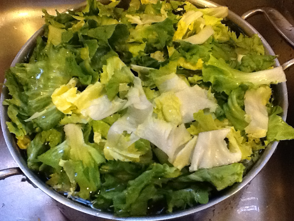 2.  Wash the escarole well and rip into large bite-size pieces.