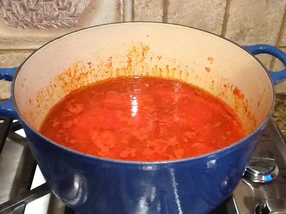 2. Add the crushed tomatoes (or squished), and simmer for 25 minutes over a medium low heat. Season with salt and pepper.