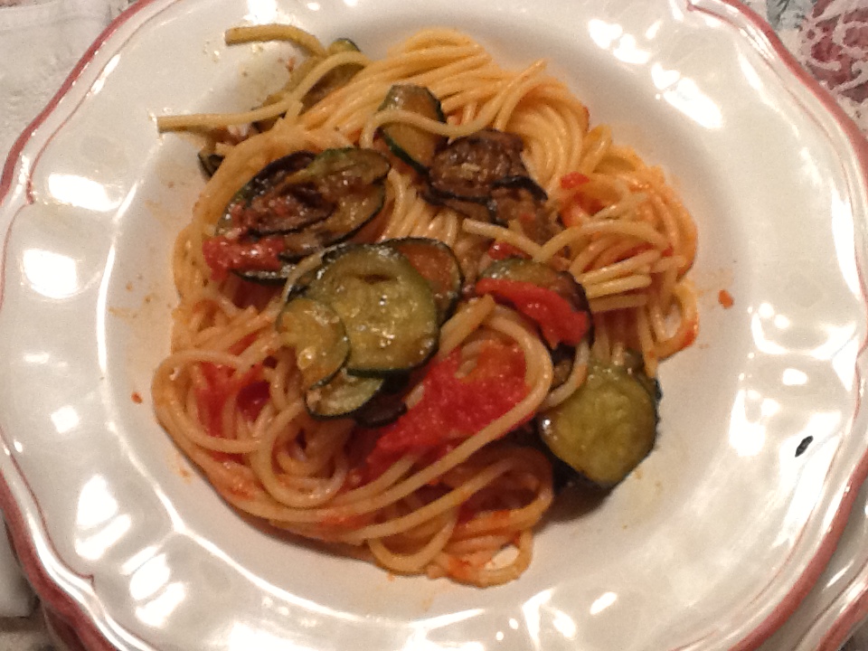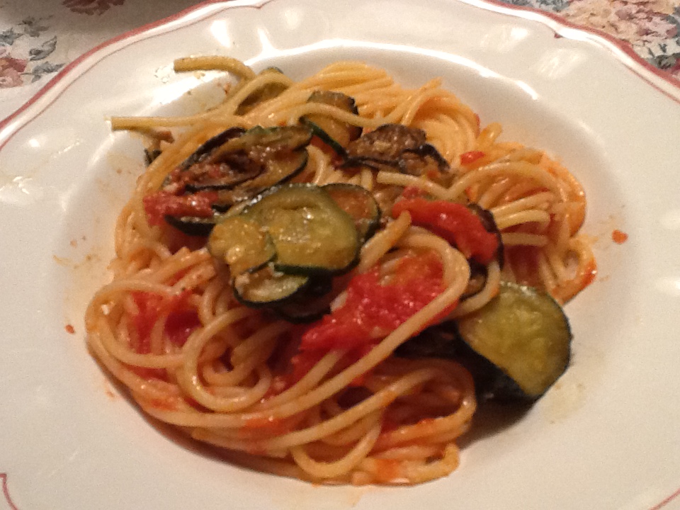 4. Once the spaghetti is cooked al dente, drain and put in a serving bowl and mix with the butter. Add the sauce and zucchini, and top with the grated cheese and fresh pepper.