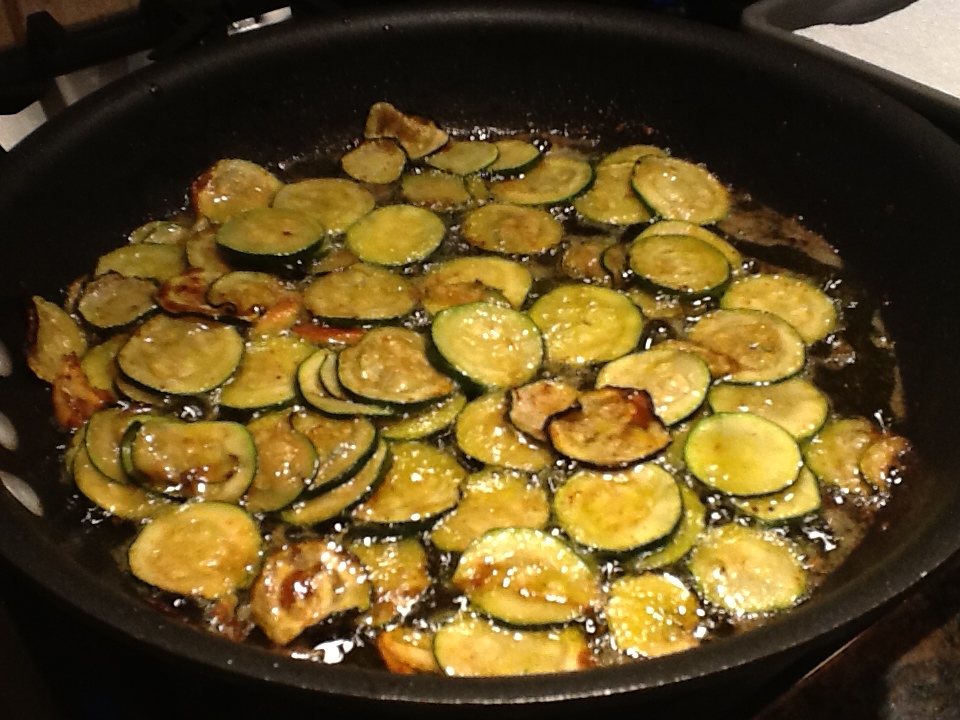 3. Meanwhile, in a fry pan, melt the butter in the oil and sauté the rest of the garlic for a minute or two. Add the sliced zucchini. Sprinkle with salt and pepper. Cook zucchini until browned on both sides. Using a slotted spoon, remove cooked zucchini and let it drain on a paper towel.