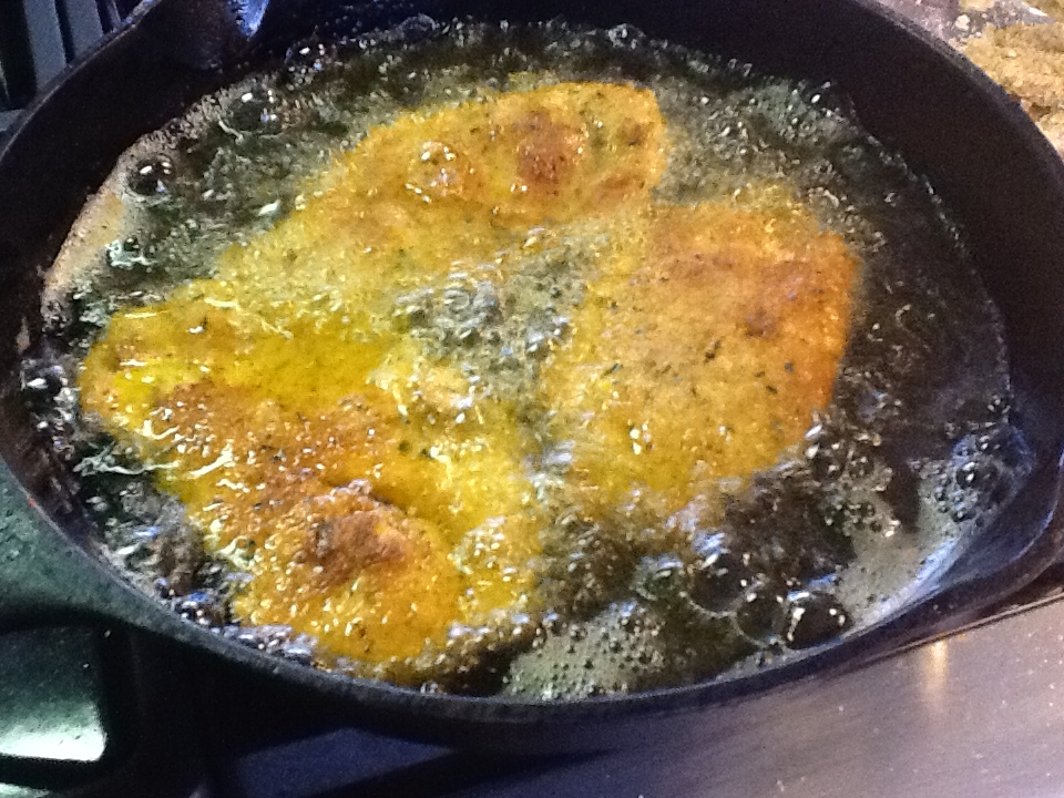 5. Place cutlet in the hot oil and brown well on both sides. You can put more than one cutlet in the oil at a time, but don’t let them touch.
