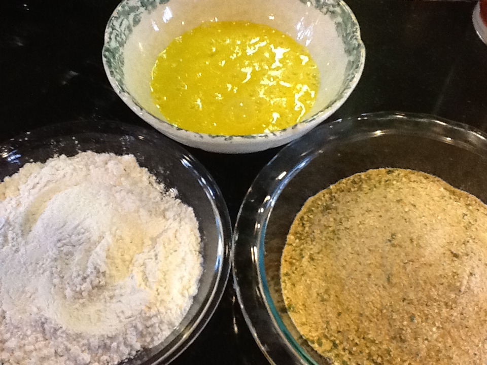 2. Put flour, eggs and breadcrumbs in 3 separate bowls. I like to use pie plates for the flour and breadcrumbs.