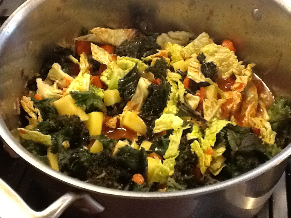 1. Heat the oil in a large stockpot. Add the onions, carrots, fennel and leeks and sauté for 5 to 7 minutes. Then add the garlic, salt, pepper and red pepper flakes and sauté another 5 minutes. Add the squished tomatoes and all their juice, the cabbage, kale and potatoes. Cook, stirring occasionally for another 10 minutes.