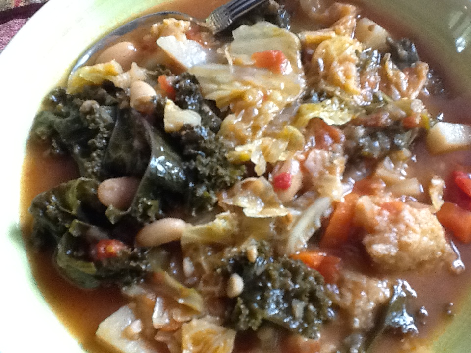 This is not a family recipe, nor is it a recipe from a friend. This is a combination of about 6 or 7 recipes that I have tried over the years. As in all Italian “peasant” recipes (this one is from Tuscany), you can really use whatever is on hand. I love to use dark or red kale, but honestly, any kale will do just fine. If I can’t find savoy cabbage, I just use regular cabbage. If I have a leek on hand, I’ll throw it in, but it’s not essential. Red onion, sweet onion…it doesn’t matter. I will say that what I think does matter is the quality of olive oil, tomatoes and broth. So use your favorites. Please don’t tell anyone, but in this recipe I use canned cannellini beans. Why not???