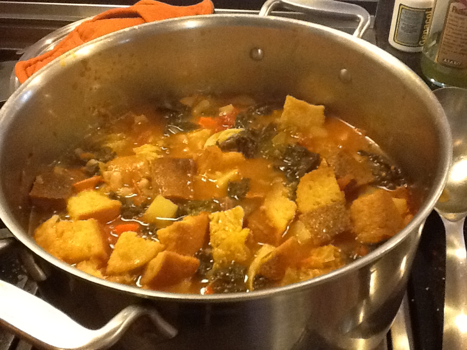3. Add the bread and simmer for another 10 minutes. Taste for seasoning.