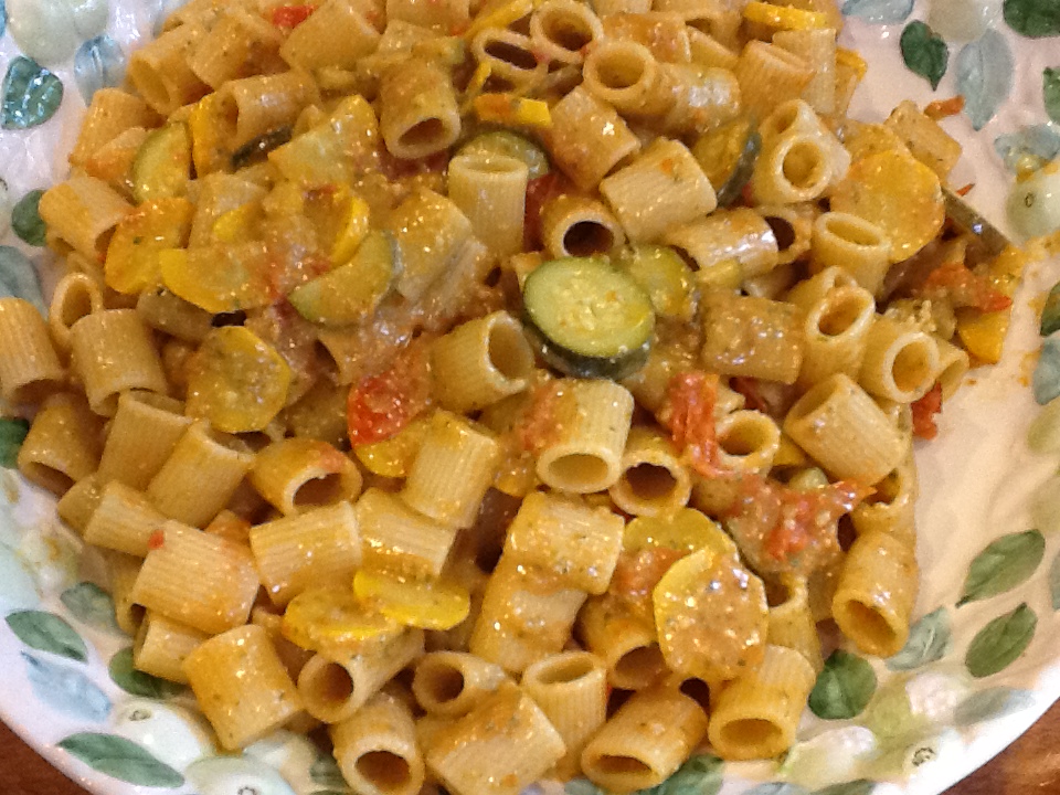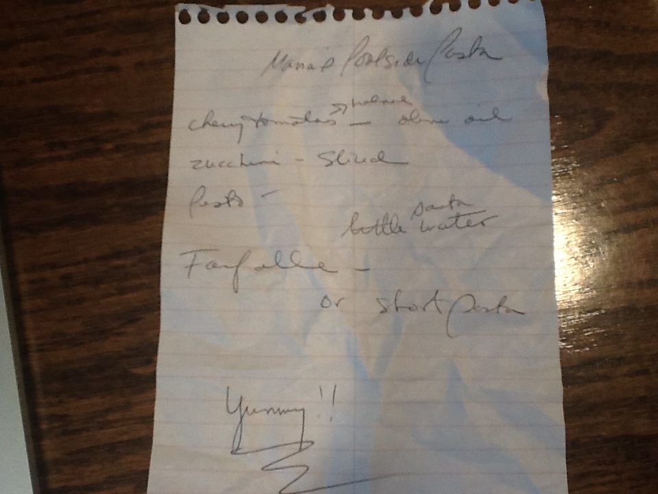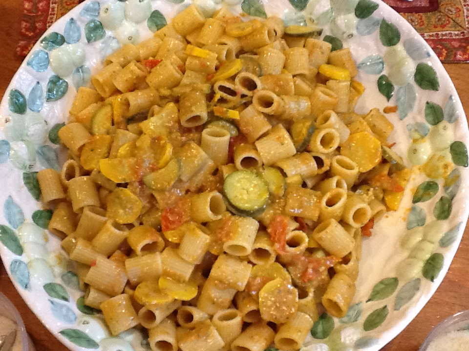 My first memory of this recipe was at a Sunday dinner, poolside at my sister-in-law and brother-in-law’s house. The setting was beautiful. We sat under a beautiful trellis, overlooking their pool and gardens. The perfume from the flowers was heavenly. Just when we thought things could not get any better, out came this beautiful bowl of pasta. I can still remember the beauty of this dish, with the colorful green and yellow zucchini, tomatoes, basil and pesto sauce. But it was the aroma that really drew me in. Everything smelled so fresh and fragrant. It was love at first bite for me. I was fortunate enough to have enjoyed this dish on several other occasions, poolside, but eventually I was smart enough to watch my sister-in-law make it. It wouldn’t be summer, if I didn’t recreate her dish at least once. And when I do, I don’t even notice that I don’t have a pool. I’m just soooo happy with each delectable bite! I know you will be too.