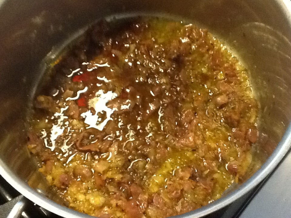 1. Put the oil, butter and onion in a saucepan and turn on heat to medium. Saute onion until pale gold (about 8 minutes), then add pancetta and prosciutto (if using). Cook for several minutes, only stirring once or twice.