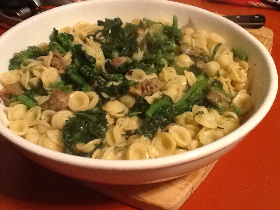 Even though this dish is traditionally from the Puglia region of Italy, and this is the region where my father’s family originated, I have no memories of anyone on this side of the family ever making this dish. Even the pasta shape, orecchiette, is a home-made pasta typical of this region. I’m sure you already know that orecchiette means small ear, which if you dig deep into your imagination, you might see a resemblance. So this traditional Pugliese dish never entered my life until it began appearing on menus in Italian restaurants. It quickly became a favorite of mine. However, I never made it myself at home. I think the reason for this is that my husband is not a fan of orecchiette, so instead we often make broccoli rabe with spaghetti and no sausage (I’m not a big fan of sausage). By the way, you can find that recipe in this blog under the pasta category.