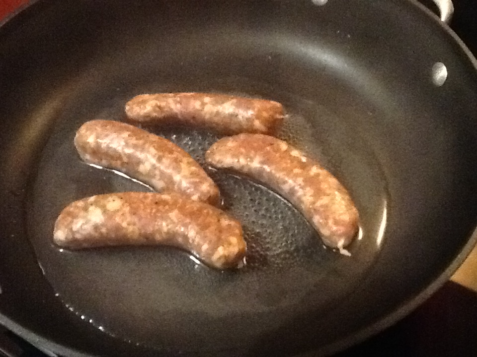 2. Brown the sausage in a fry pan with a tablespoon or two of water. Then remove from the pan and slice. (Lydia skips this step).