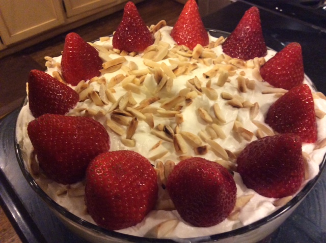 7.  Beat the cream and sugar until stiff.  Spread over trifle.  Sprinkle with almonds.  Garnish with the whole berries.