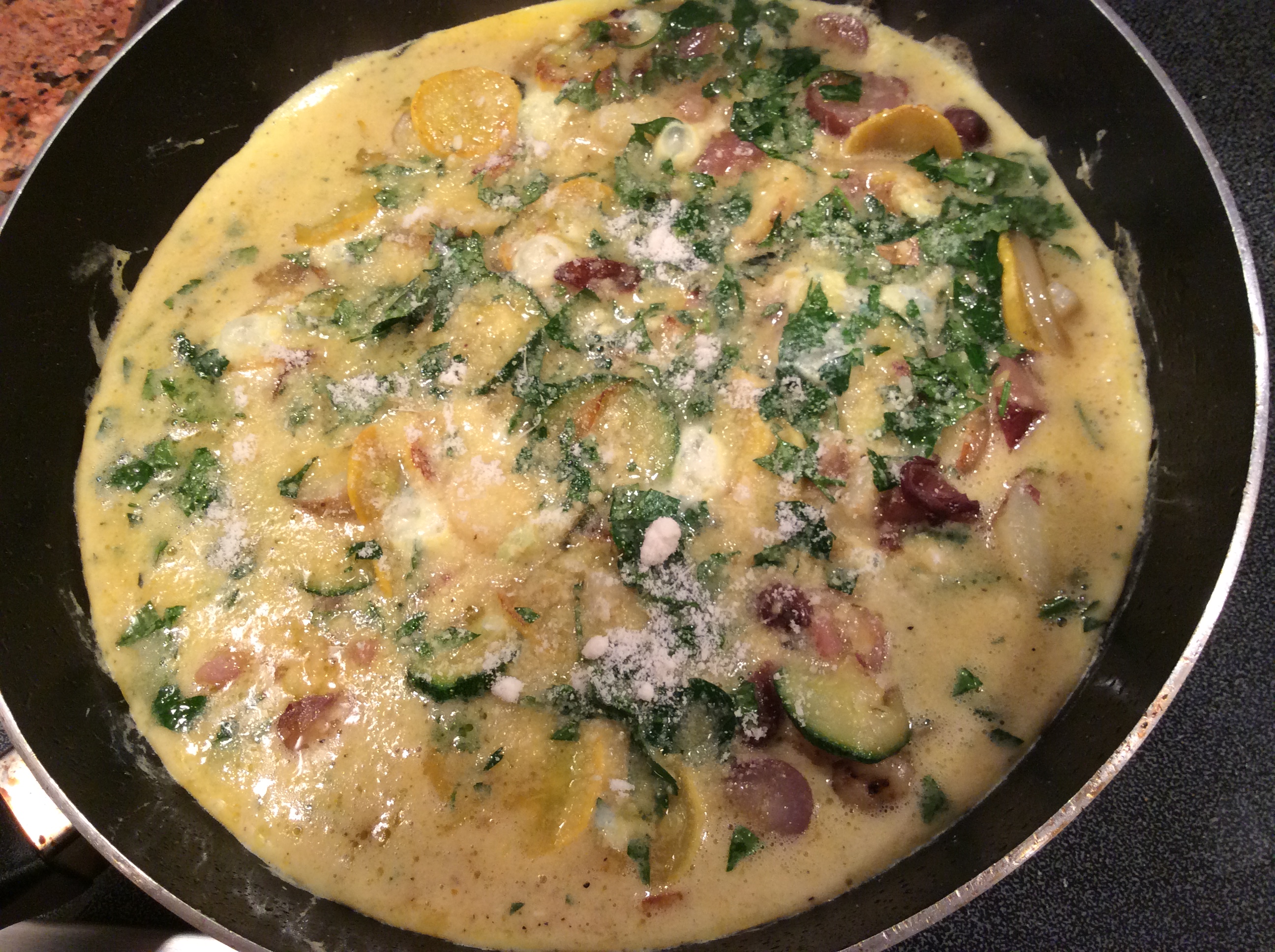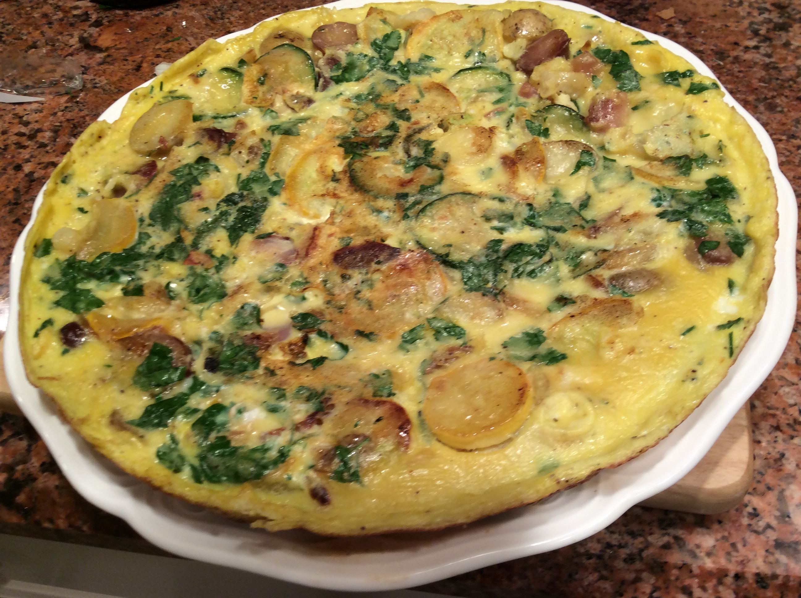 I love to just say the word “frittata.” It has such a lyrical sound. Such a beautiful word for a dish made up of eggs and potatoes and vegetables. The combination of ingredients is endless. Of course, everyone has a favorite choice of possibilities. I have so many combinations that delight my palate, but I think my absolute favorite is zucchini, onions and potatoes. These flavors really seem to go together beautifully with a little Parmigiano cheese and some fresh parsley.