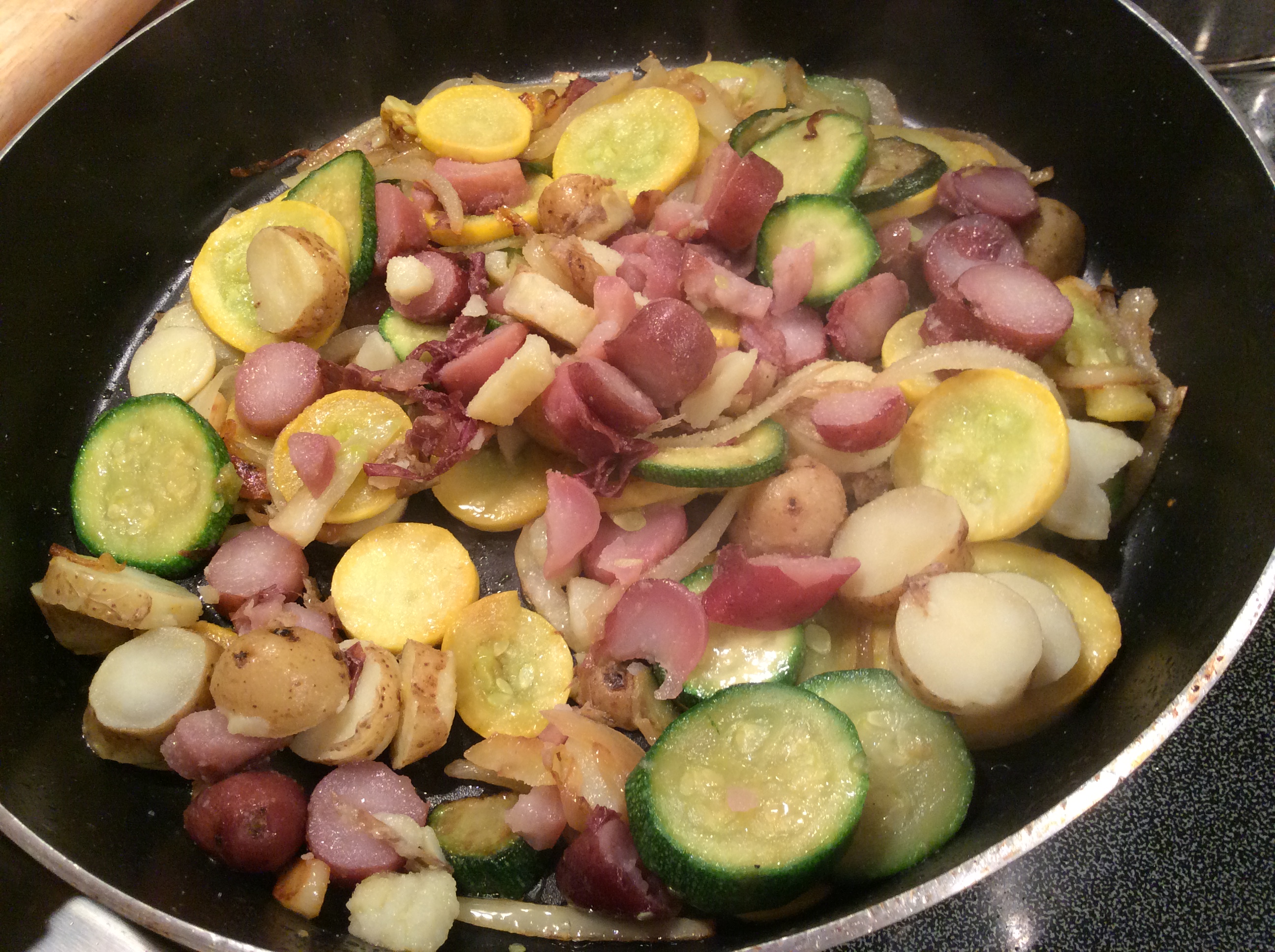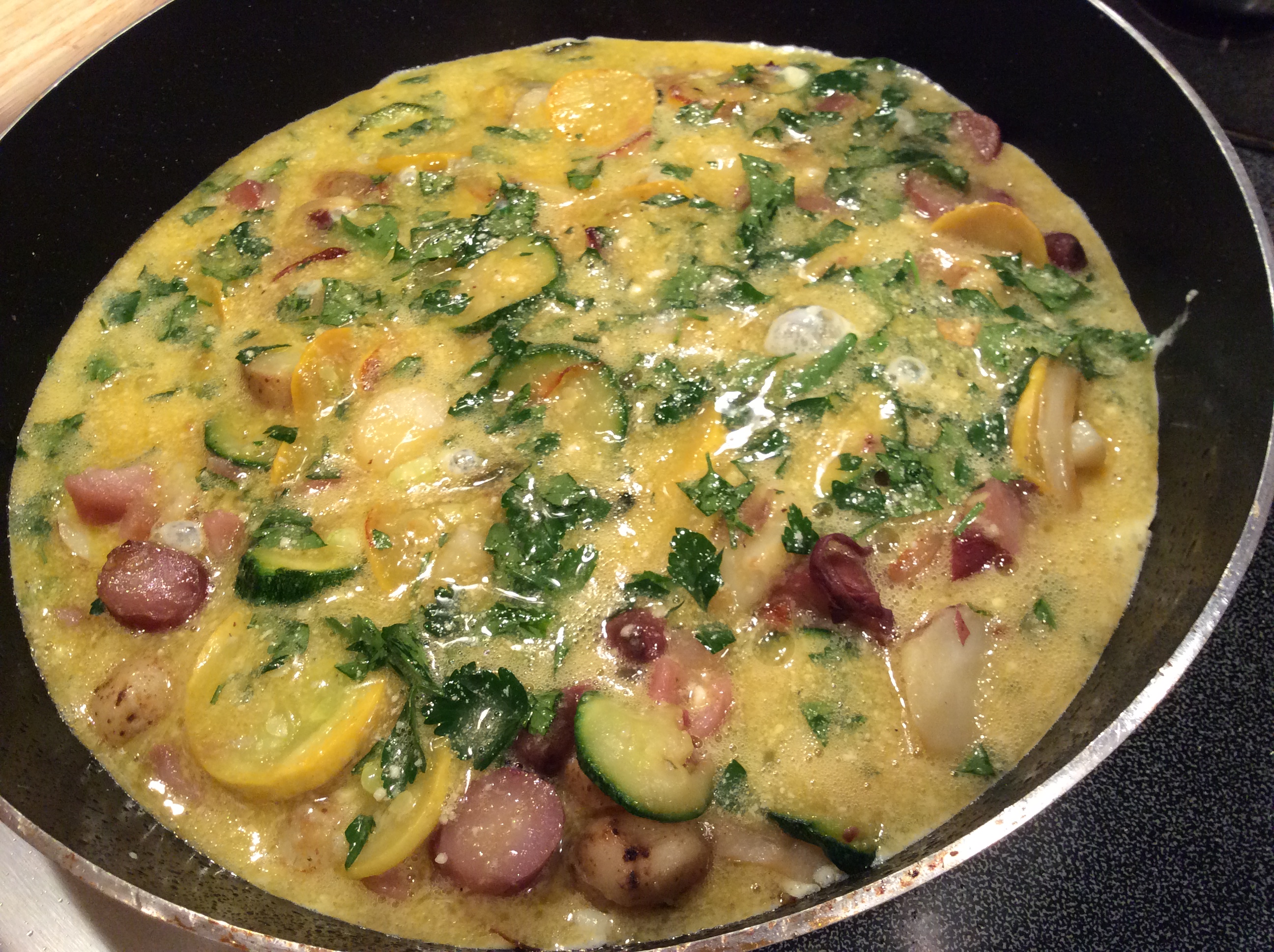 4. Pour the egg mixture on top of the zucchini and potatoes, and cook over medium low heat.